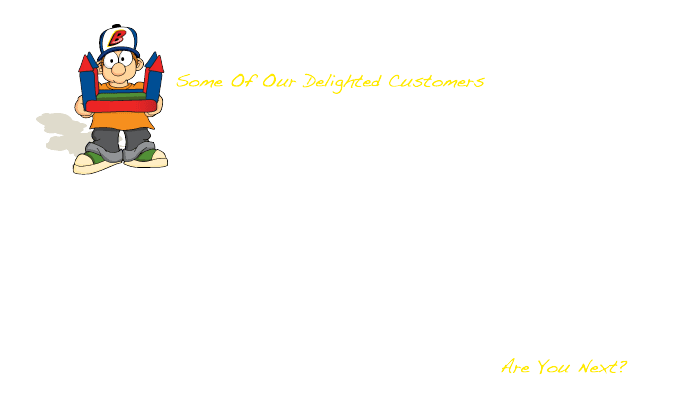 Government Of The United States Of America, Ultimate Obstacle Course and Bouncing Castle. Laura Aged 6. Dublin 17. 15ft x 15ft Star Bouncer. South East Health Executive. Slide + Bouncy Castle. Zach Aged 12. Eniskerry Co Dublin. Mega Obstacle Course. Wicklow Rugby Club. Jumbo Obstacle Course. Ben Aged 8. Tallaght. Castle with Slide. Crumlin Children’s Hospital. Fully Enclosed Bouncing Castle. Pamela Aged 4. Killiney Co Dublin. Frozen Bouncy Castle. Punchestown Race Course Carnival Package. Vanessa + John’s Wedding Terenure Dublin 6. Rainbow Slide. Josh Aged 10 Brittas Bay Co Wicklow. Rainbow Obstacle Course. St John of Gods Hospital Stillorgan. Safari Park Obstacle Course and bouncing castle. Cairn Aged 14 Rathdrum Co Wicklow. Cars Bouncing Castle. St Catharine’s Hospital Newcastle Co Wicklow. 15ft Star Bouncer. David Aged 21 Rathfarnam Jungle Fun Run. St Andrews College Booterstown. Schools Sports Day. Kelly Aged 4 Roundwood Karnival Kids Games. St Gerard’s School Thornhill Rd Bray Co Wicklow. Sumo Suits. Elisa Aged 15 Kilcolle. Monsters Inc. Bouncing Castle. Bubble Gum Club Ireland. Bouncing Castles and Pop Corn Machines. Keith Aged 12 Dalkey. Obstacle Course. NUI Maynooth freshers week. Bungee Run + Wrecking Ball. Sandra Aged 6 Ballyfermot. 12 ft Nut House. University College Dublin Kids Summer Camps. Sam Aged 13 Arklow. Amber Springs Hotel Gorey. Emma Aged 6. Sandycove Co Dublin. Arklow Bay Hotel Arklow, Harry Aged 10. Brittas Bay Co Wicklow. RNLI Arklow Jane Cabinteeely Aged 30. Ashford GAA Club. Paul Aged 2 Saggart Co Dublin. Leopardstown Hospital Dublin 18. Ashling Aged 11 Blackrock Dublin. East Glendalough School Wicklow Susan Aged 9 Redcross. Jobstown Community Centre Tallaght Alison Aged 5 Ballinteer. YMCA Sandymount Dublin4. Anne Aged 7 Merrion Rd. Dublin 4 Nigerian Embassy Dublin 4. Eamon 18 Delgany Wicklow. Tinakilly House Hotel Rathnew. Christopher Aged 4 Months Foxrock. Tallaght Deaf Club. Clodagh Aged 18 Sandycove. Wild Wicklow Tours Stephen and Mathew Aged 10 Dalkey. Irish Rail. RTE. Nieve Aged 9 Redcross St Lawrence’s School Greystones. James Aged 7 Stepaside Educate Together Greystones. Ranelagh Lucan. Warren Aged 9 Avoca. Little Bray Youth Centre Bray.Leslie Aged 8. Rathnew. Metropolitan Church Irishtown Dublin 4. Paddy Aged 80 Yes 80 Dunlaoire. Taney Church Dundrum. Josh Aged 16 Dartry. Arab Mosque Clonskeagh Dublin 14.. Terenure Synagogue Dublin 6 .Susan Aged 12 Howth. Siobhan Aged 14 Wicklow. Methodist Church Dundrum Dublin 14. Chris Aged 3 Liffey Valley. St Patrick’s Boys School Wicklow Town Obstacle Course for sports day. Declan Aged 8 Clontarf. Lansdowne Tennis Club. Jenny Aged 5 Drimnagh Princess Castle. Croke Park Convention Centre, Bungee Run, Wrecking Ball. Tommy Aged 8 Walkinstown 12ft x 12 ft Star Bouncer. The Park Academy Greystones Banner Bounce + Slide. Rachel Aged 24 Rathmichael Rainbow Slide. Shoreline Leisure Bray Activity Summer and Holiday Camps. Eliz Aged 10 Deensgrange Obstacle Course. David Lloyd Tennis Centre Clonskeagh Summer Sports Camps and Birthday Parties. Colim Aged 9 Santry Banner Bouncer. ESB Cork Festival Package. Tony Aged 40ish. Templeogue. Dublin 6 Bouncing Castle ,Castlenock Hotel And CountryClub Party Package 2.